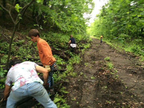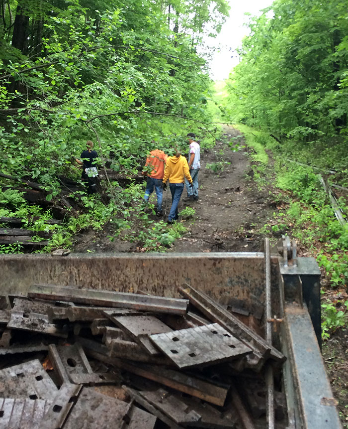 Some of the work in creating the MRG is in planning and negotiating, some is in finding the funds . . . and a lot is in hard physical labor. Today was a day of clearing rail plates and joint bars from the section between APD and the Timken bridge area. We are almost finished with that task – one more push will take care of it. Alex and Emma Bryan, Eliza McClellan and Jerry Halstead were with Paul Coats and a 1-ton dump truck from 8:30 to 12:30. Thanks to all who, in so many ways, are helping us move forward!