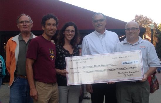 August 28th, prior to Lebanon’s End-of-Summer fireworks, Timken plant manager, Bob Bauman, and colleagues Melanie Huston and Steve Arenburg, joined MRG leaders on the Lebanon Mall to present the Greenway with a check for $352,900. Thank you Timken Aerospace Foundation in Canton, Ohio, and your community-minded foundation!