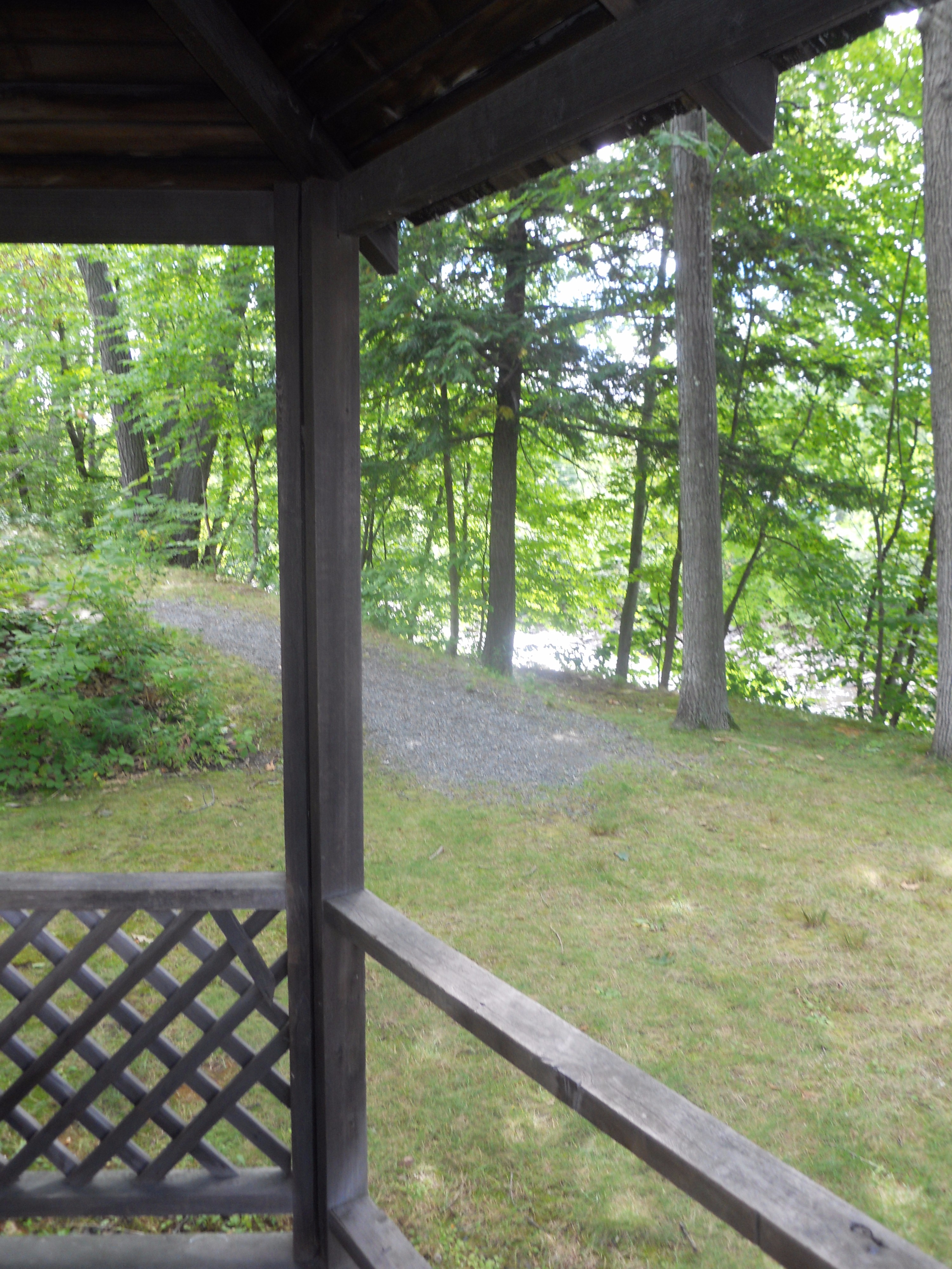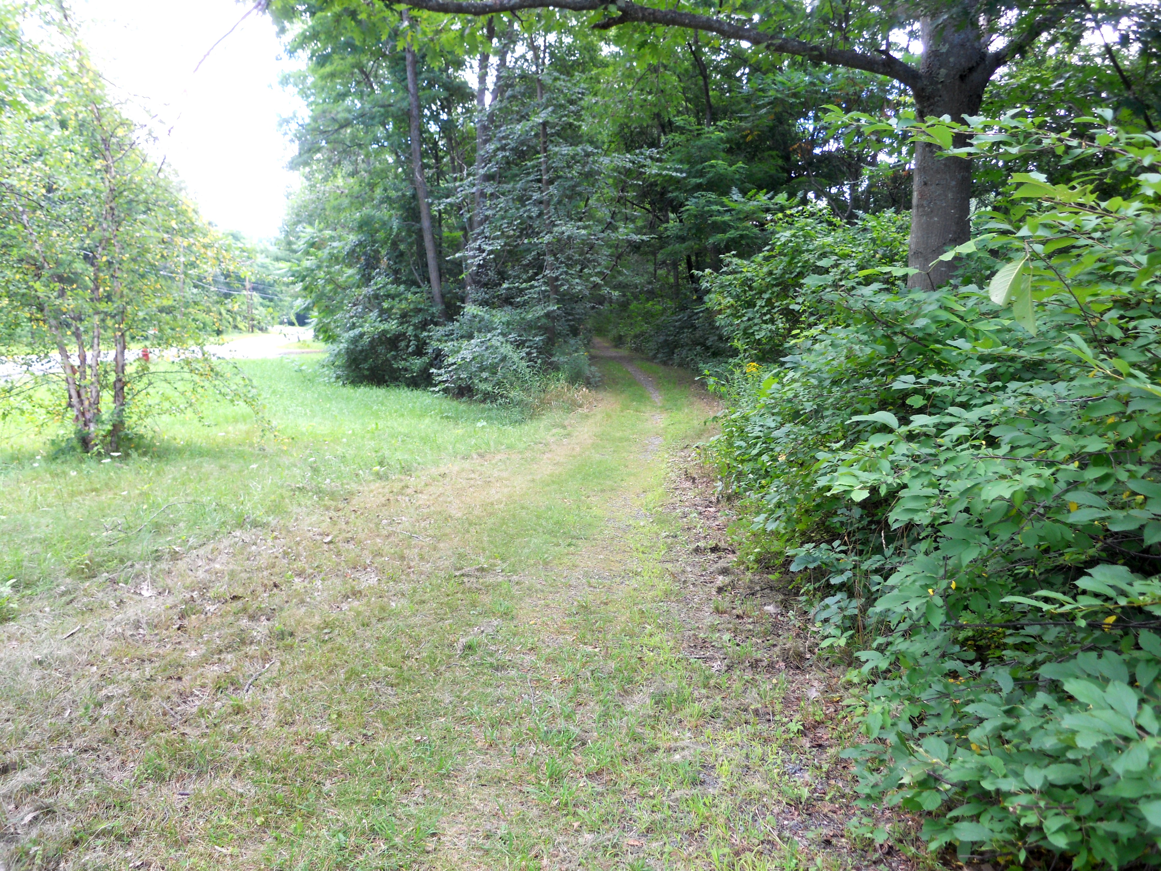 The path begins at the gazebo on the east end of the Powerhouse Mall parking lot, runs briefly along Glen Road, then heads into the woods toward the river.