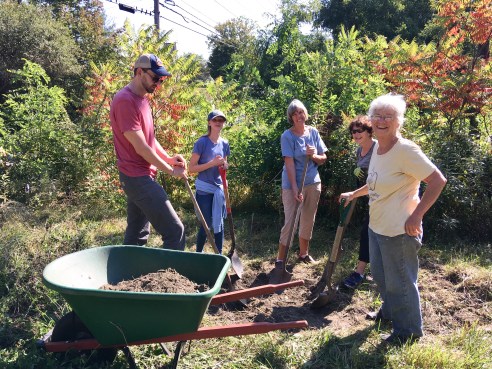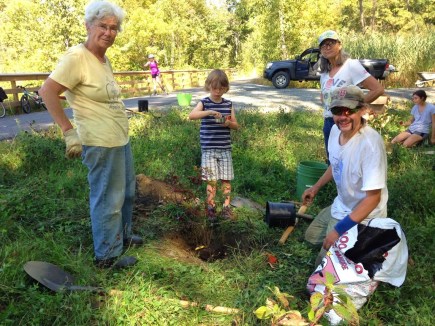 Kye, Bodhi, Barbara, and Eric planting the wetland rose bush.