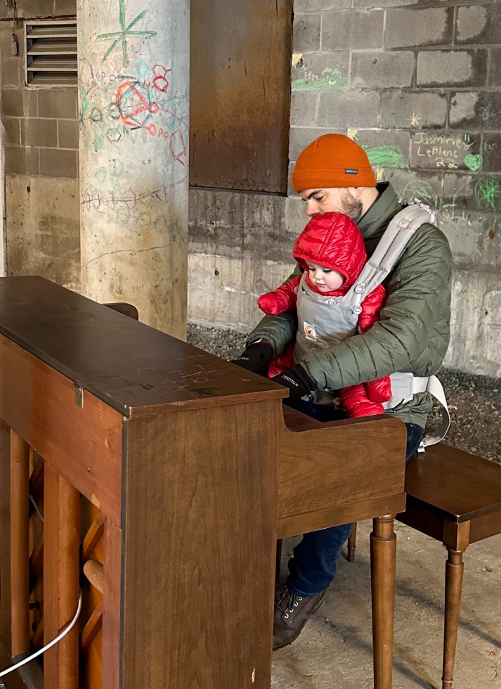 Sean, visiting Lebanon from Portland, Oregon, enjoyed discovering the piano on his walk through the tunnel with baby Io. He appreciated the tunnel’s acoustics!