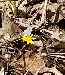 The adult Spring Azure butterfly uses its proboscis to drink nectar from early spring flowers.