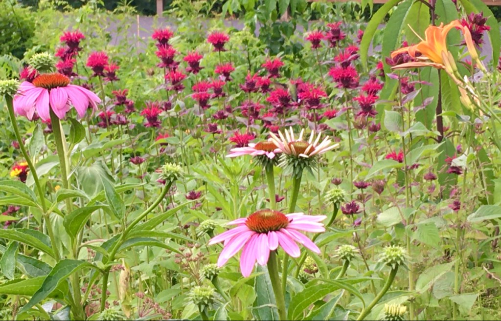 * Pollinator garden at the MRG access at the intersection of Mascoma/Mechanic/High streets (Here we are collaborating with nature: common milkweed, Queen Anne’s lace, clover, and goldenrod were already in place.)